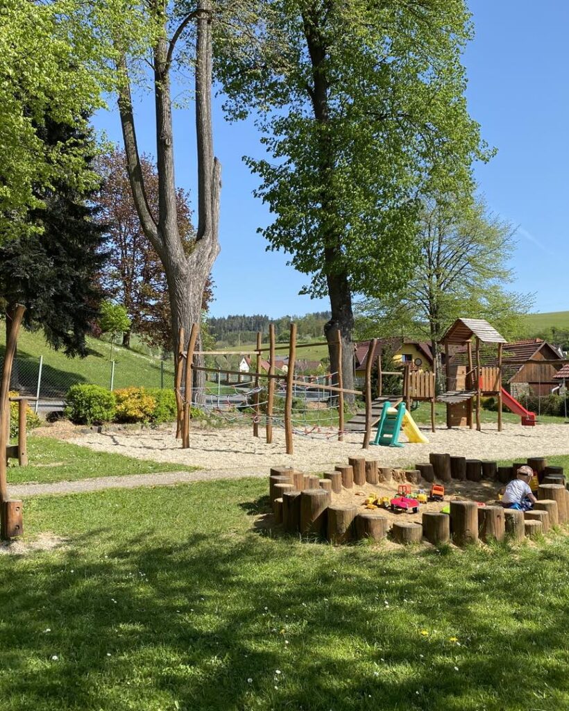 Vedle kostela je krásné hřiště, kde je dostatek stínu